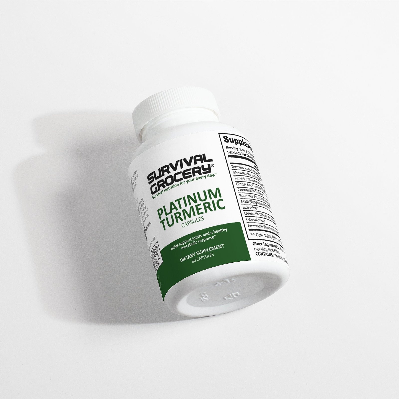 Ingredients: Turmeric Root Powder, Glucosamine Sulfate 2KCI, Turmeric 95% Curcuminoids, Ginger Root Extract, Chondroitin Sulfate, Boswellia Extract, MSM, BioPerine®, Quercetin Dihydrate, L-Methionine, Bromelain, Cellulose (vegetable capsule), Rice Flour.